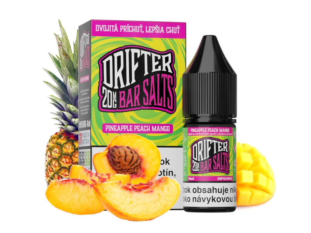 Drifter Bar Salts Pineapple Peach Mango je určený pre každého, kto miluje bohaté ovocné chute a chce si vychutnať sladký tropický zážitok počas celého dňa. Odporúčame ho pre používateľov POD systémov a MTL e-cigariet, ako aj pre tých, ktorí prechádzajú z klasických cigariet a hľadajú alternatívu s lahodnou chuťou.