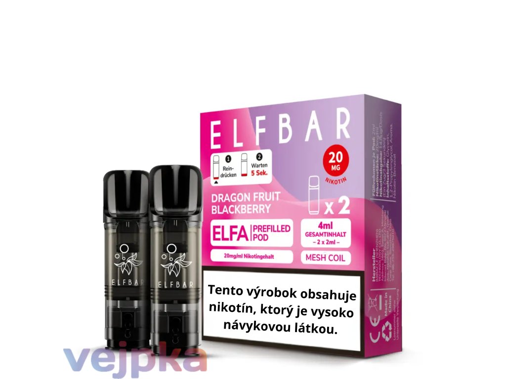 Každé balenie Elf Bar ELFA Dragonfruit Blackberry obsahuje 2× predplnený POD. Transparentný dizajn náplní umožňuje sledovať zostávajúce množstvo e-liquidu. Vďaka jednoduchej výmene si môžete ľahko meniť príchute podľa nálady.