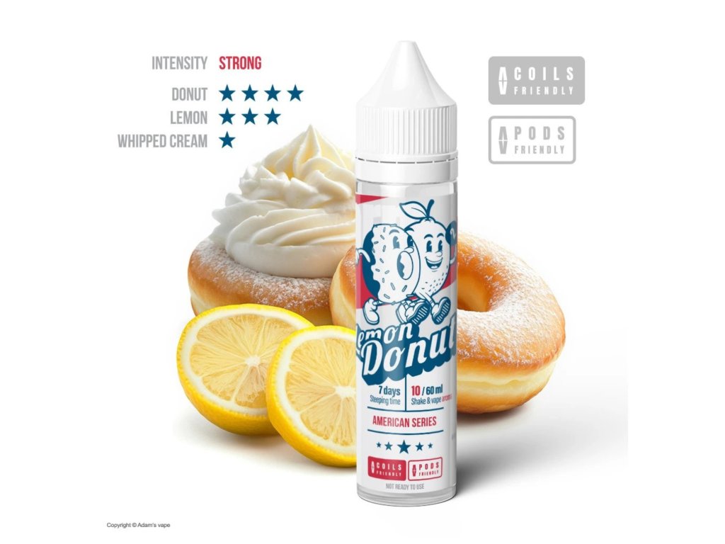 Adam’s Vape Lemon Donut je dezertná Shake & Vape aróma zo série American Series, ktorá prináša kombináciu sladkého donutu a sviežeho citrónového glazovania. Výsledkom je lahodná a jemne citrusová chuť, ktorá spája sladký dezertný základ s príjemne sviežim citrónovým nádychom. Aróma je ideálna pre tých, ktorí hľadajú dezertný longfill s originálnym cukrárskym charakterom. Neobsahuje nikotín a je určená na miešanie s bázou a boosterom.