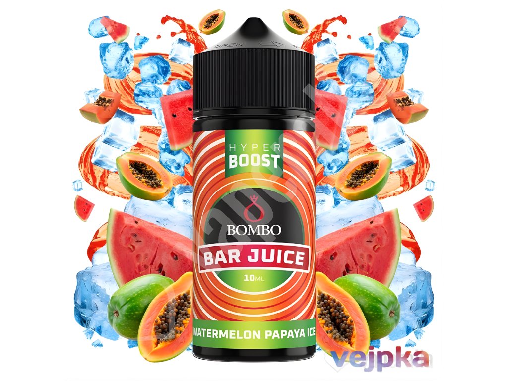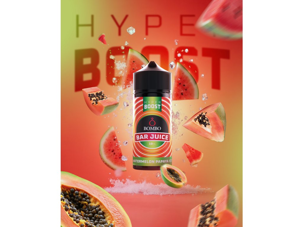 Bombo Bar Juice HYPER Boost Watermelon Papaya Ice je extra koncentrovaná aróma, ktorá spája sladkastý šťavnatý melón s exotickou papájou a jemným ľadovým efektom. Stačí ju zmiešať s bázou a boostrom a vytvoriť si tak intenzívny hotový e-liquid. HYPER Boost séria ponúka 10 ml superkoncentrovanej arómy v priestrannej 120 ml fľaši, čo umožňuje doliať až 110 ml bázy a pritom zachovať plnú, výraznú a stabilnú chuť. Aróma neobsahuje nikotín, no vzťahuje sa na ňu spotrebná daň.