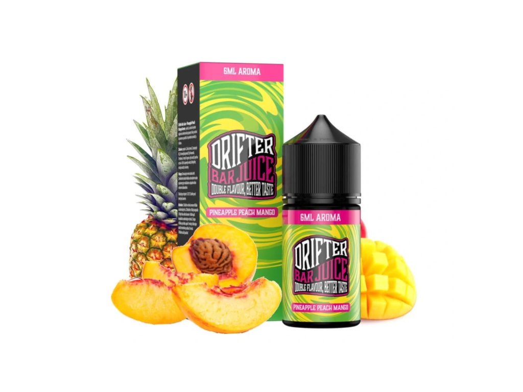 Longfill Drifter BAR Juice Pineapple Peach Mango prináša exotickú kombináciu sladkého ananásu, šťavnatej broskyne a tropického manga. Táto aróma je vysoko koncentrovaná a neobsahuje nikotín. Pre dosiahnutie hotového liquidu na vapovanie je potrebné zmiešať arómu s bázou a boostrom.
