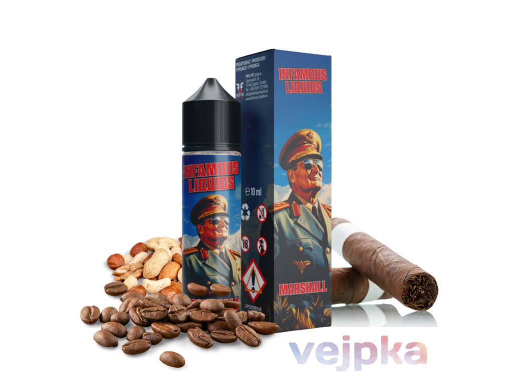 Longfill INFAMOUS Specials Marshall je koncentrovaná aróma so spojením cigary a silnej kávy. Na prípravu hotového e-liquidu túto Shake and Vape arómu zmiešajte s bázou a boostrom. Praktická fľaša je navrhnutá tak, že obsahuje menej arómy, než je jej celkový objem – stačí ju jednoducho doplniť bázou/boosterom, pretrepať a nechať odstáť. Výsledný e-liquid je bezpečný a kvalitou porovnateľný s hotovými e-liquidmi. Aróma neobsahuje nikotín a vzťahuje sa na ňu spotrebná daň.