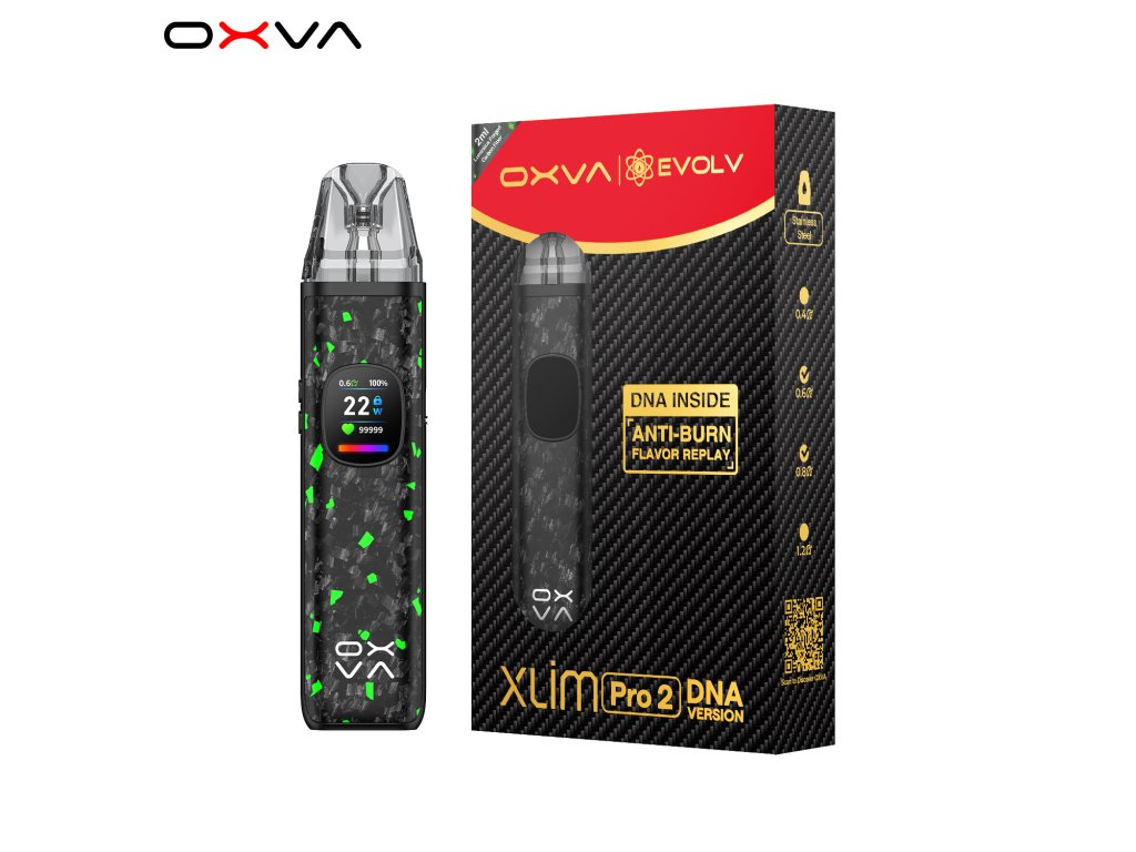 OXVA XLIM Pro 2 DNA je inteligentná verzia populárneho modelu XLIM Pro 2. Ako vôbec prvý POD systém s DNA čipom (vyvinutý v spolupráci OXVA x EVOLV) ponúka pokročilú ochranu pred prepálením, inteligentné rozpoznávanie štýlu vapovania a možnosť zopakovať si svoj obľúbený potiahnutie cez funkciu Replay.